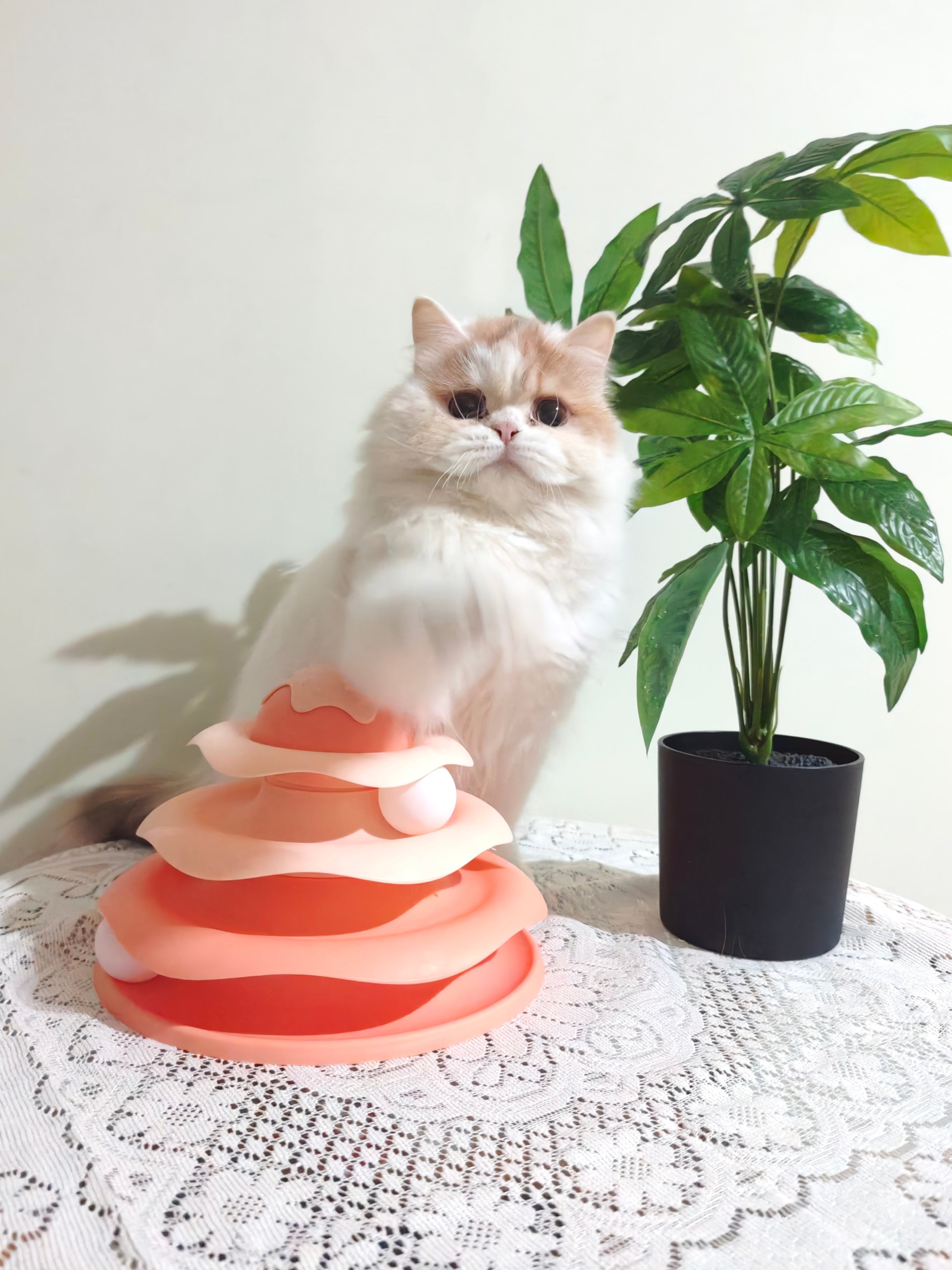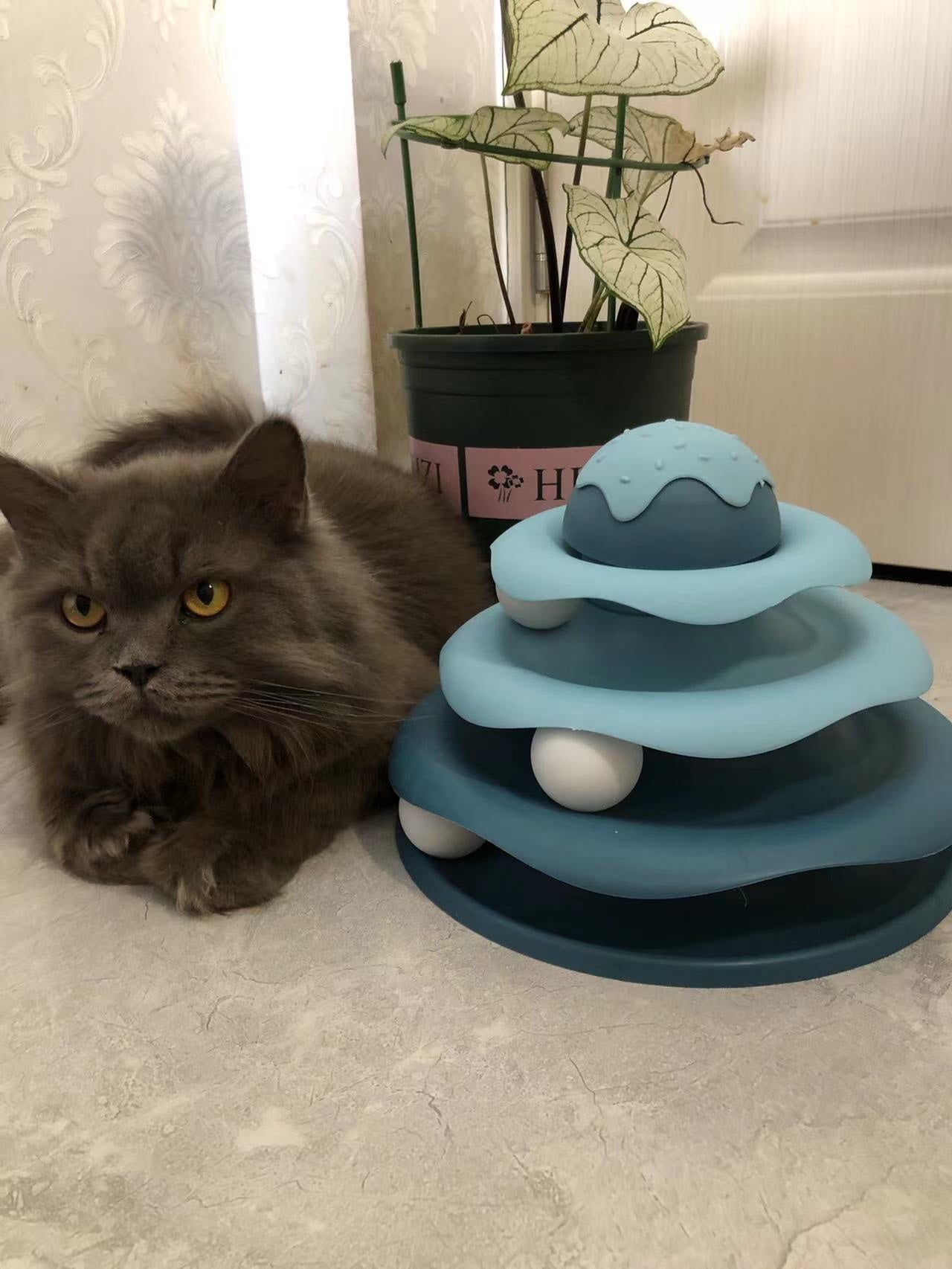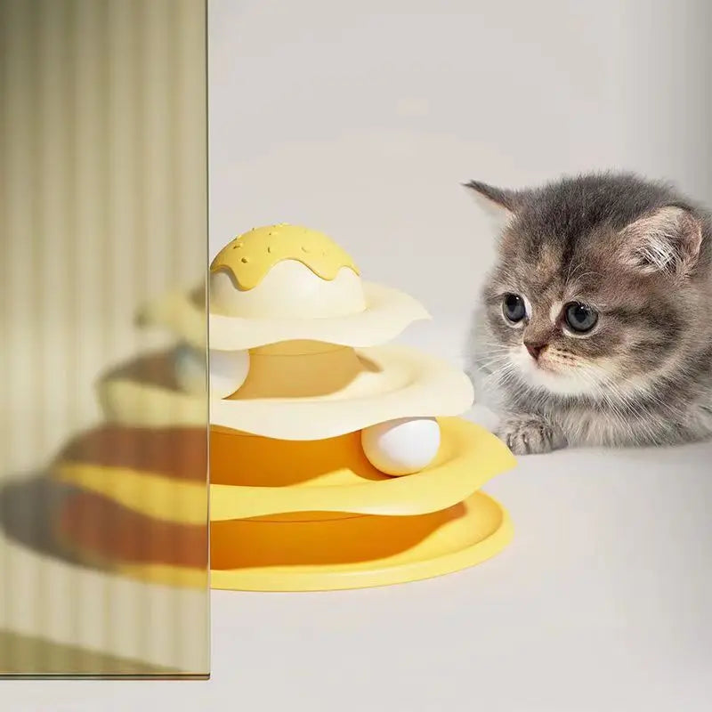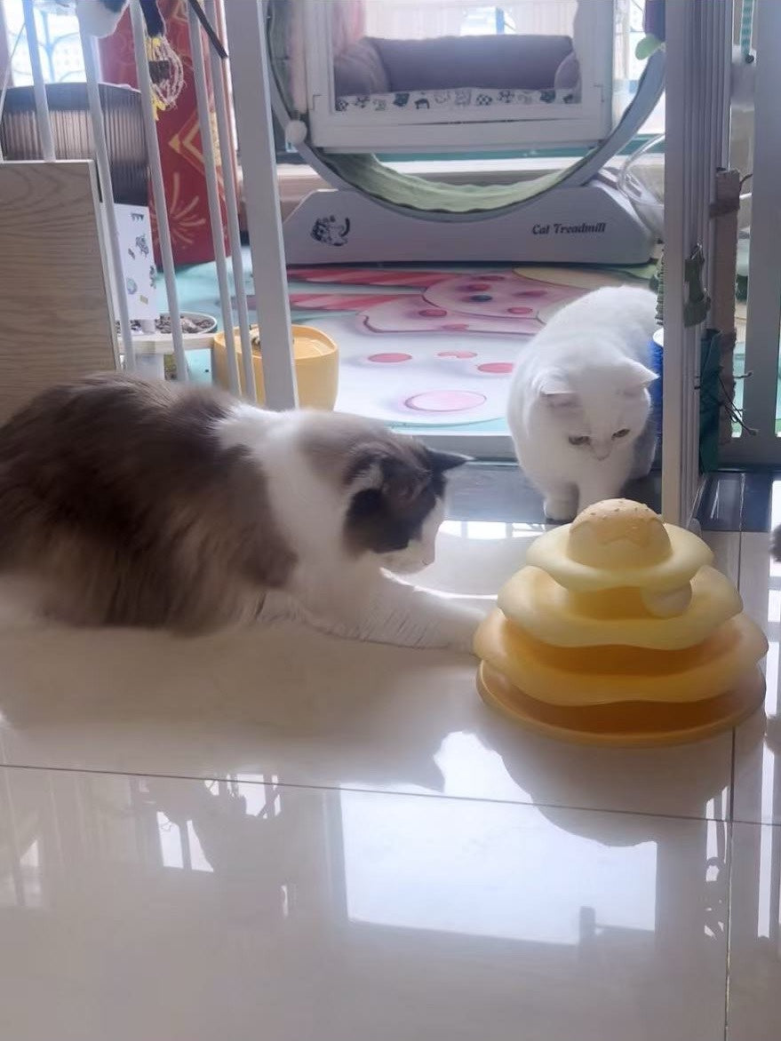 Mỗi tầng là một "đường đua" riêng với quả bóng tròn trượt quanh, kích thích bản năng săn mồi và vận động của mèo.