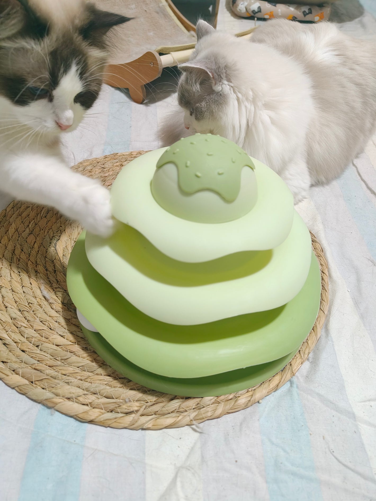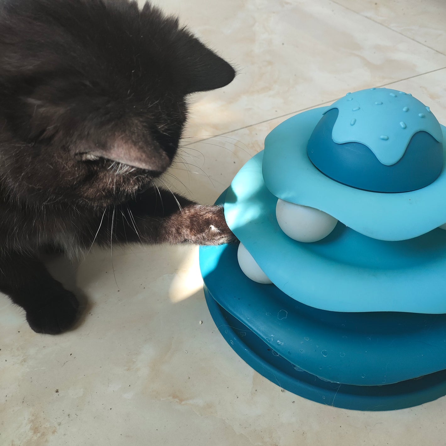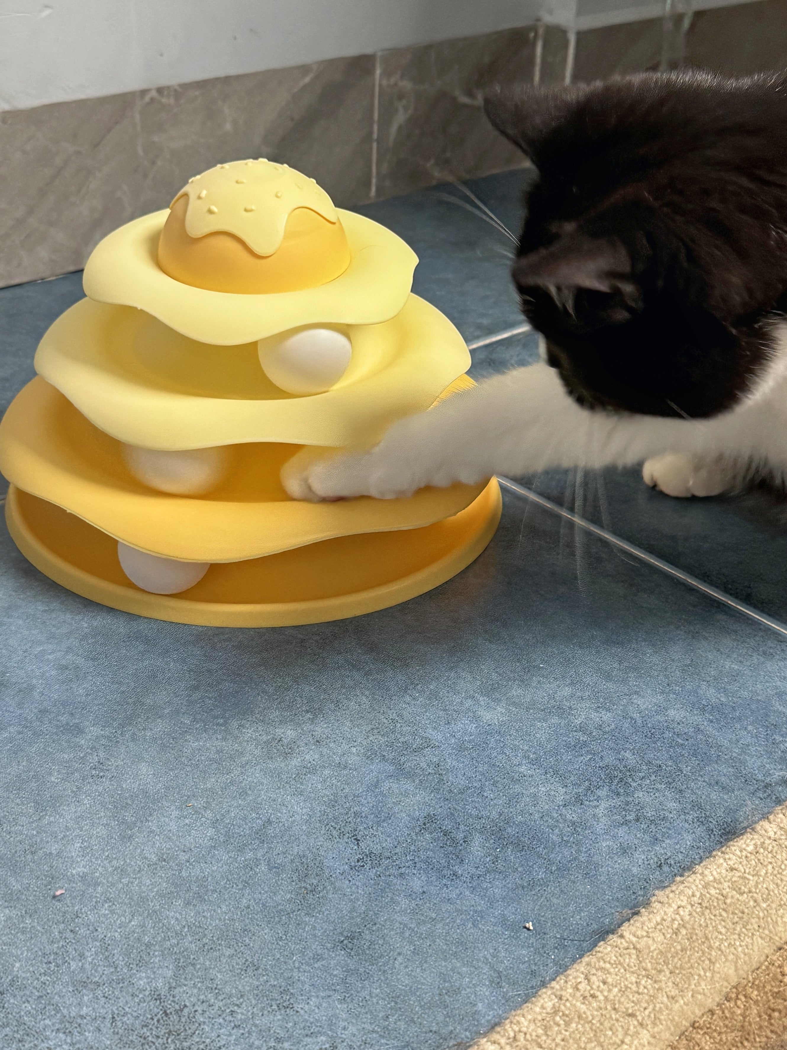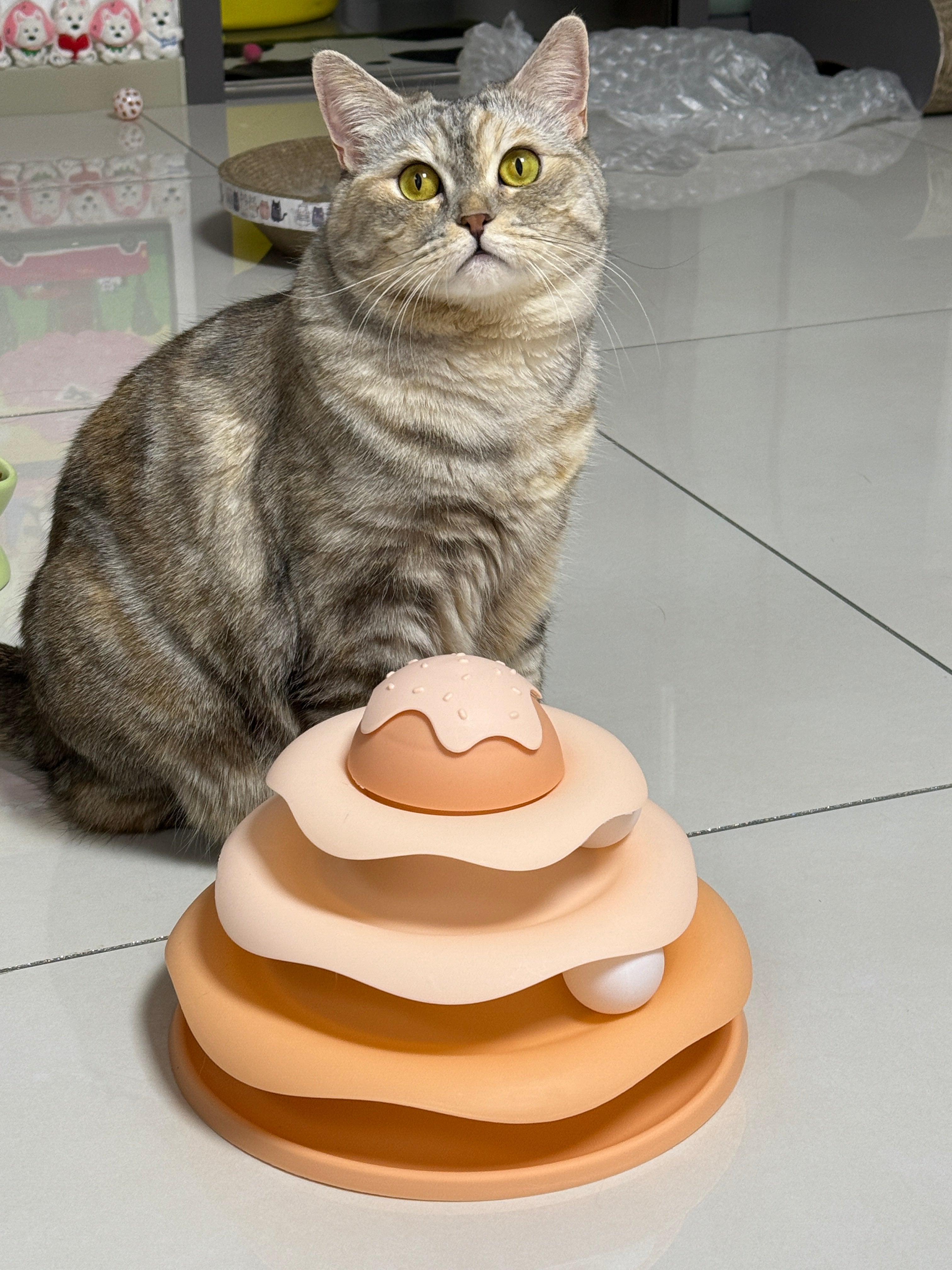 Mỗi tầng là một "đường đua" riêng với quả bóng tròn trượt quanh, kích thích bản năng săn mồi và vận động của mèo.